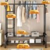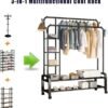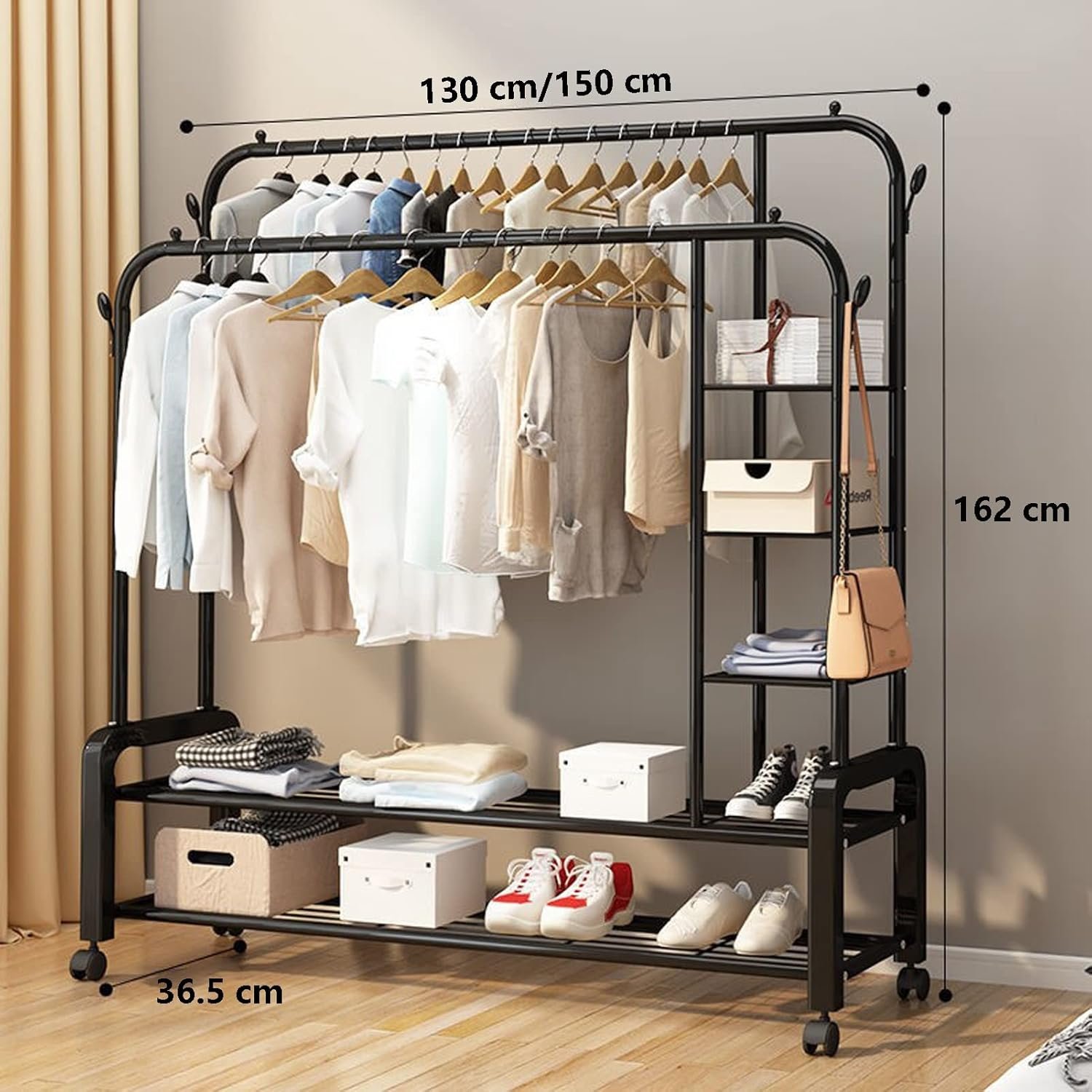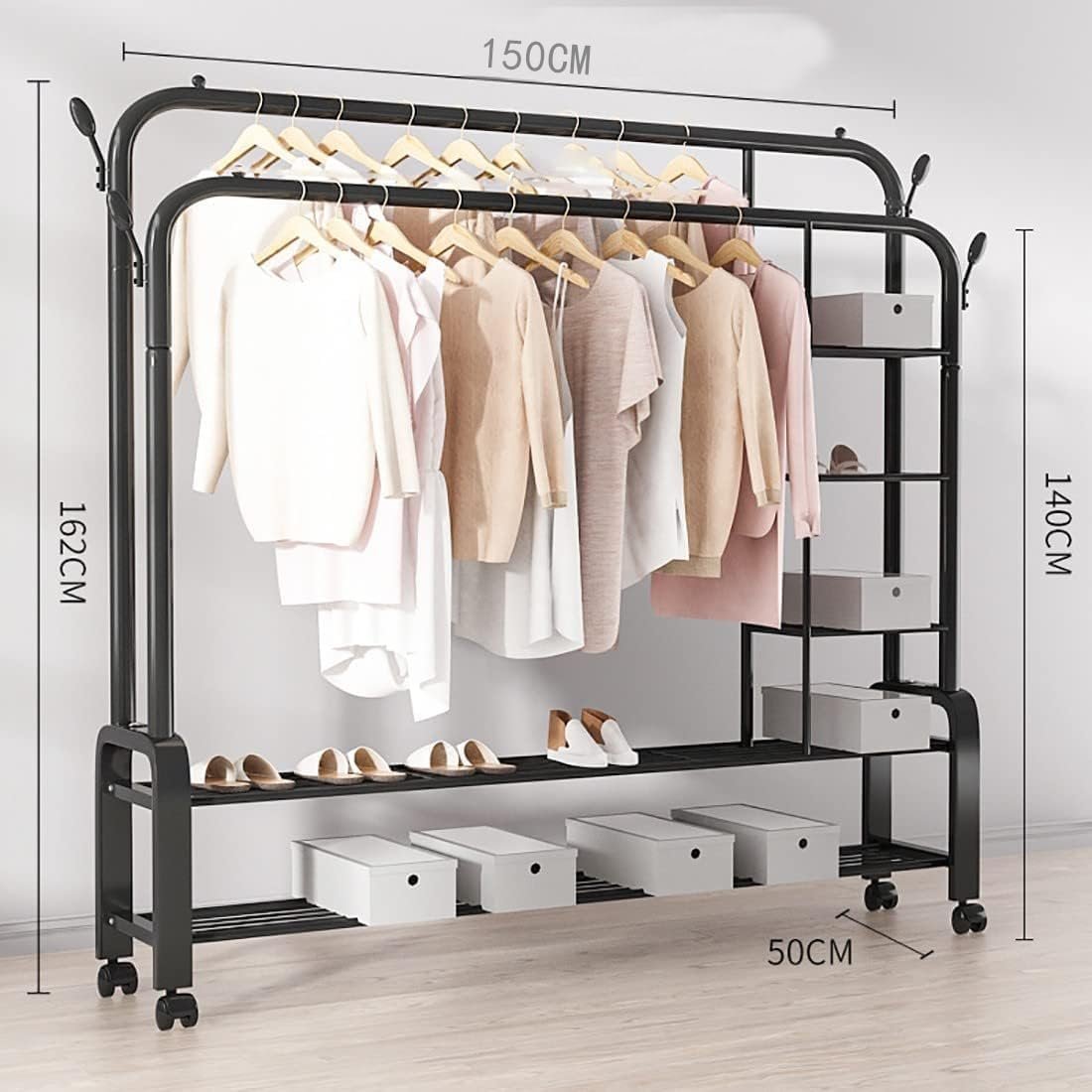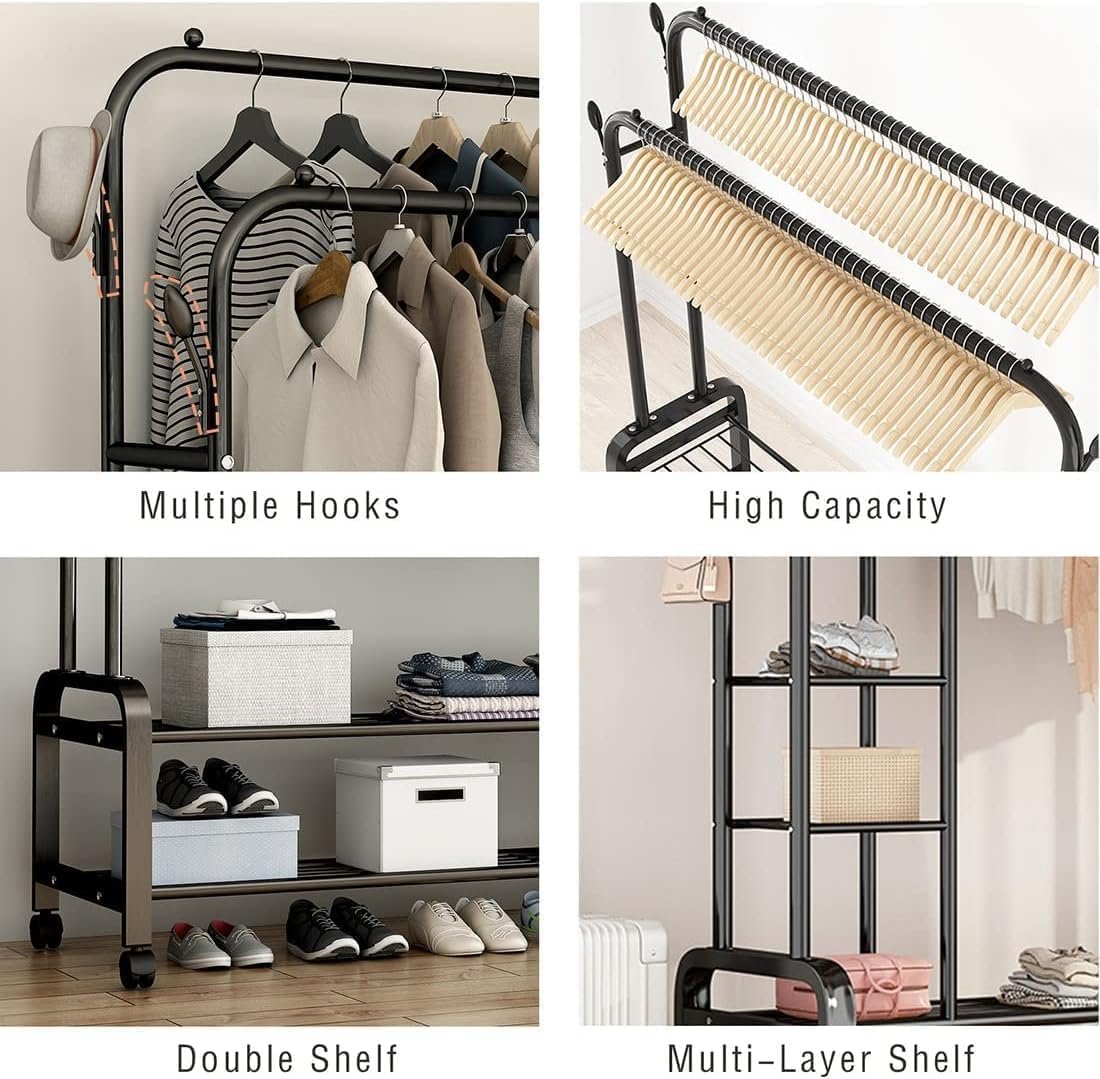 Double-Rod Garment Rack with Wheels โ€“ Heavy-Duty Clothes Organizer with Storage Shelves (Black)